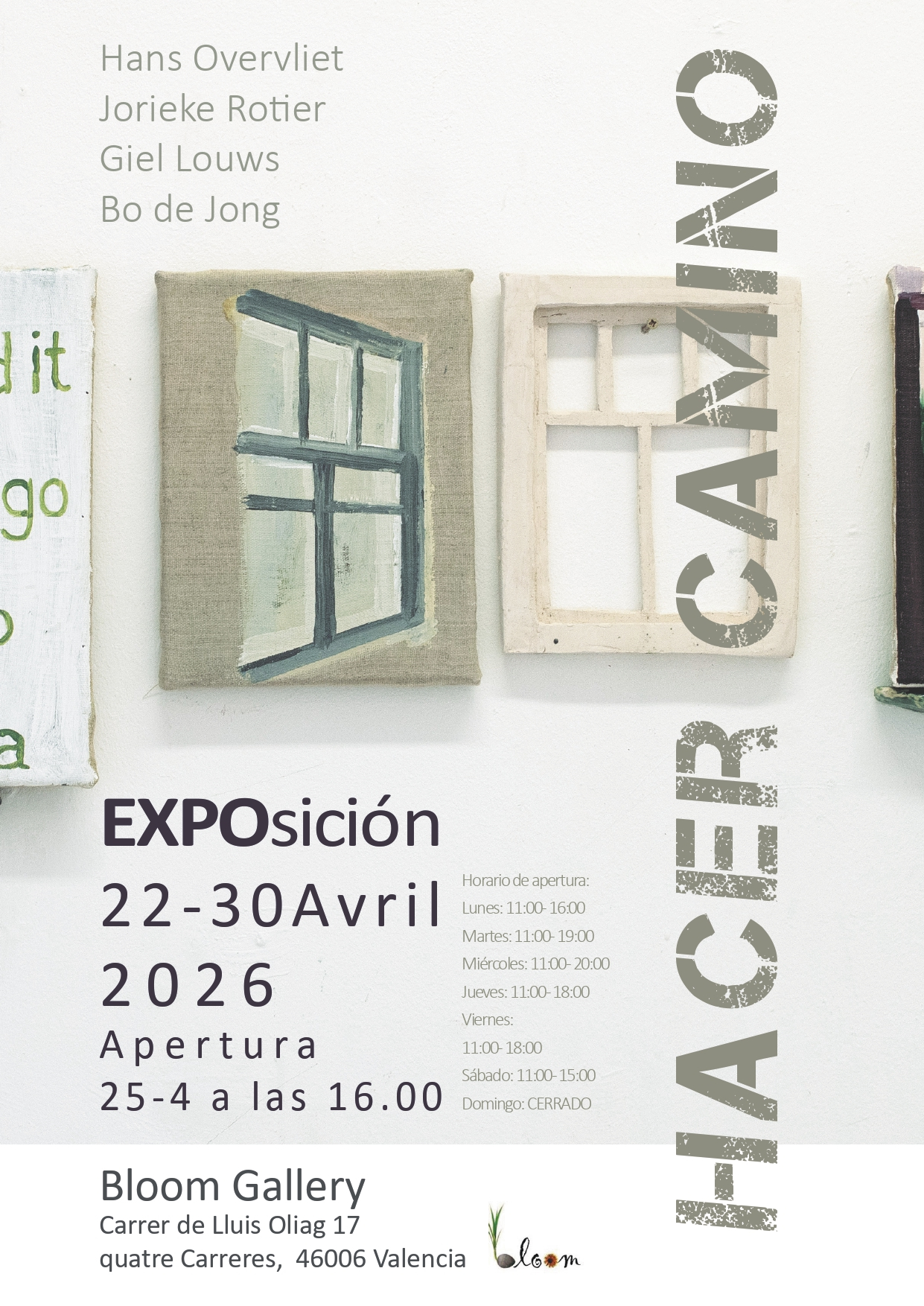 Bloom gallery Valencia, HACER CAMINO 22- 30 April 2026, met Bo de Jong, Jorieke Rottier en Hans Overvliet.